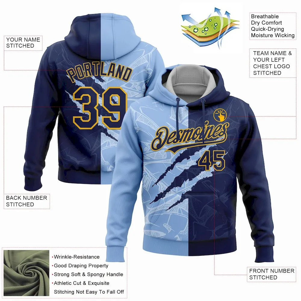 Custom Stitched Graffiti Pattern Navy Light Blue-Gold 3D Scratch Sports Pullover Sweatshirt Hoodie